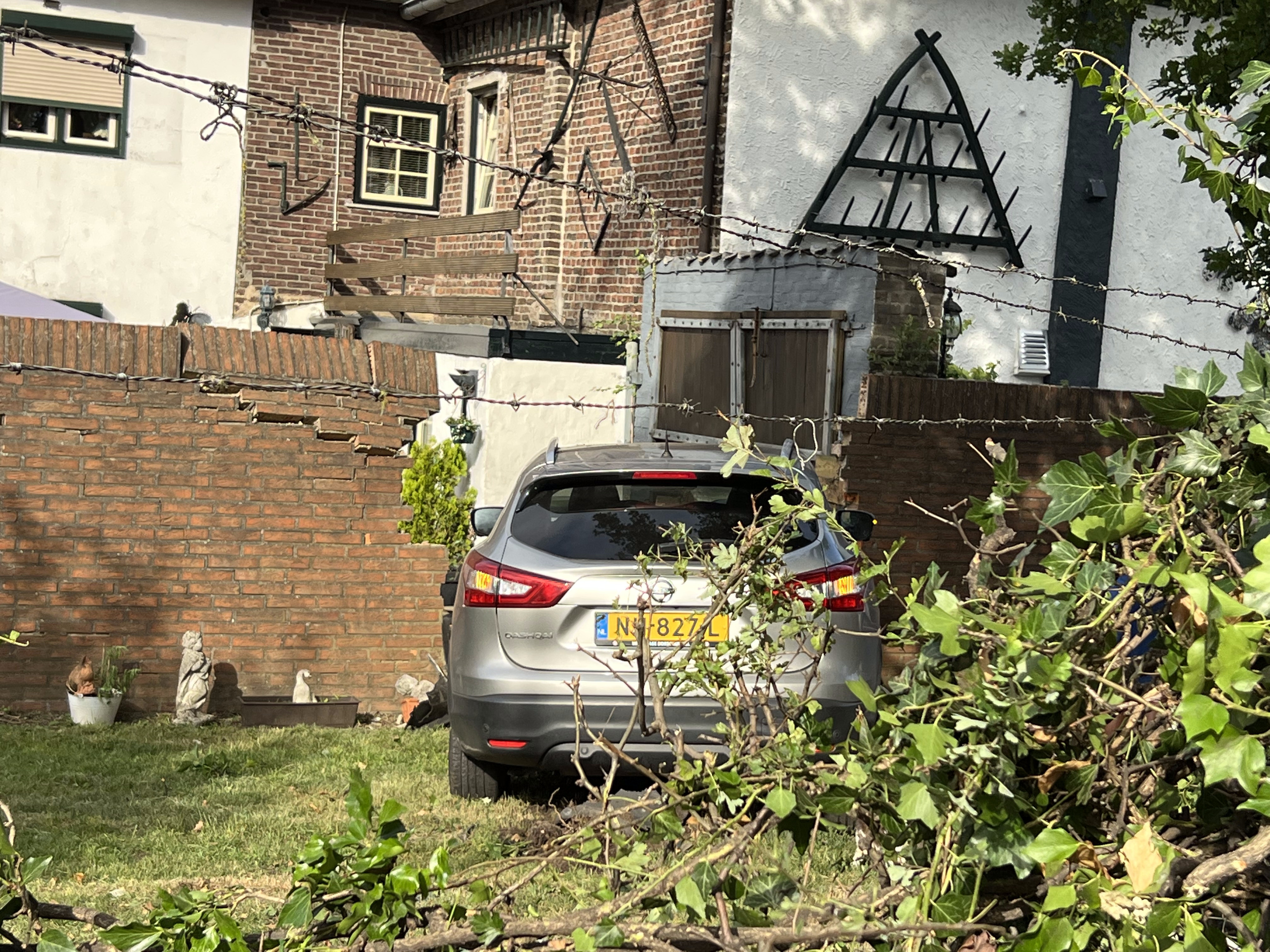 Naast een gat in de heg raakten stenen muur en de auto behoorlijk beschadigd.