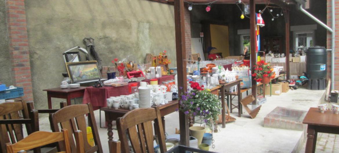 De markt is op de binnenplaats van de boerderij met de groene poort aan de Titus Brandsmastraat 5 in Brunssum. Van 11.00 tot 16.00 is iedereen van harte welkom om te komen snuffelen tussen de aangeboden spullen.