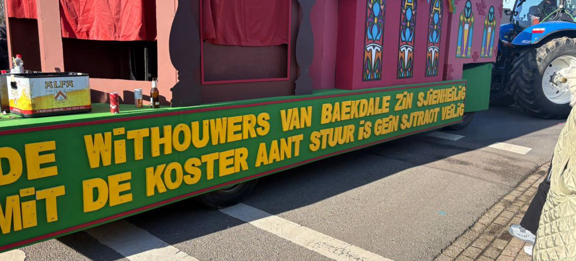 Op de wagen prijkt in felgele letters de tekst: "De withouwers van Baekdale zin sjienheilig. Mit De Koster aant stuur is gein stroat veilig”. Daarmee neemt de carnavalsvereniging uit Hulsberg op ludieke wijze het incident rond voormalig wethouder Levin de Koster op de hak.