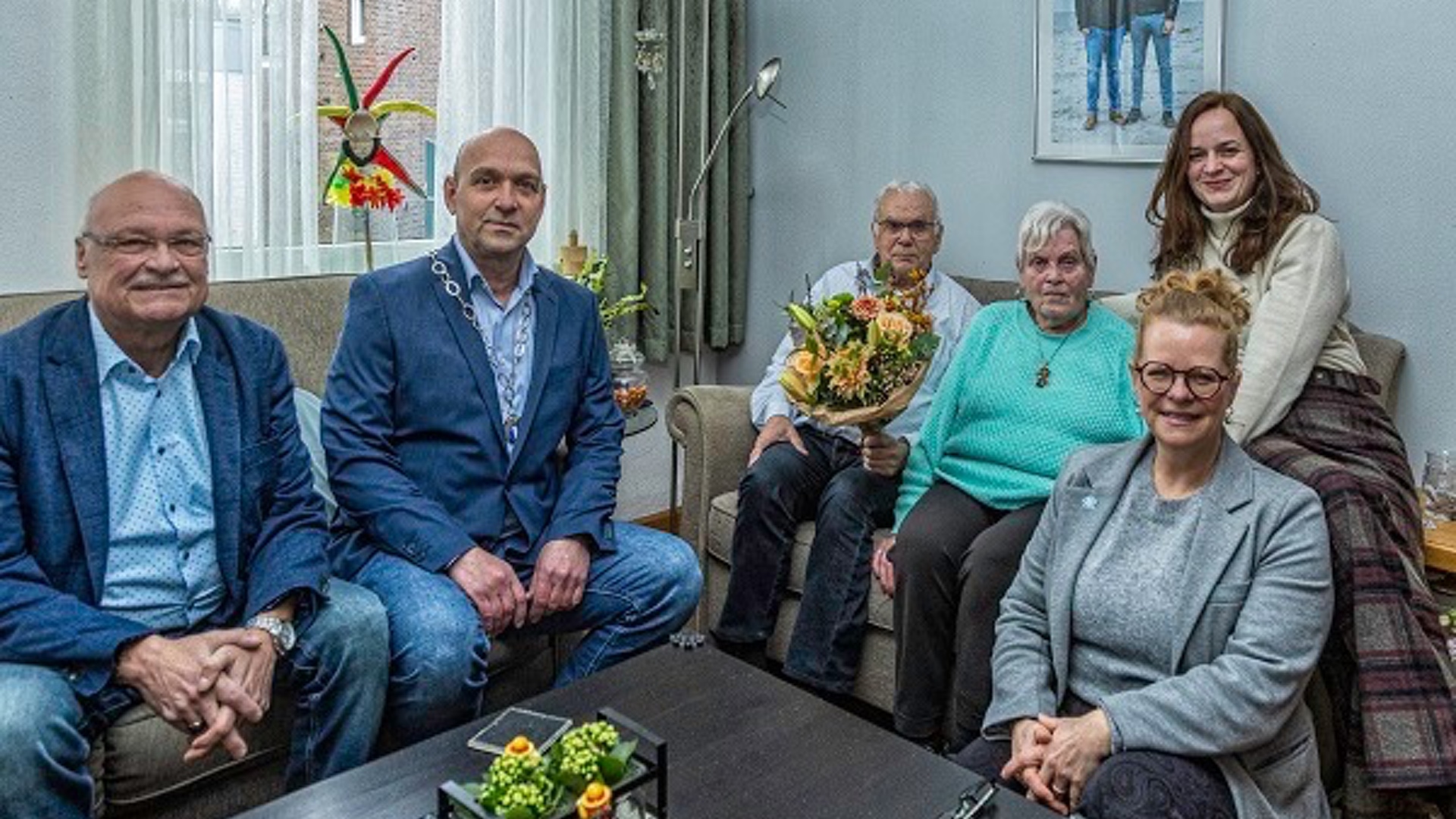 Loco-burgemeester Peter Spirk en de wethouders van Simpelveld bezochten het diamanten bruidspaar en namen een mooie bos bloemen mee.