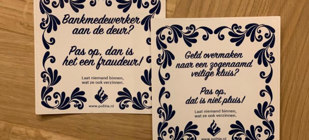 De gemeente Heerlen en politie zijn een stickeractie gestart. In de vorm van delfts blauwe tegeltjes waarschuwen de stickers tegen het afgeven van pinpasjes en bankinformatie aan oplichters.