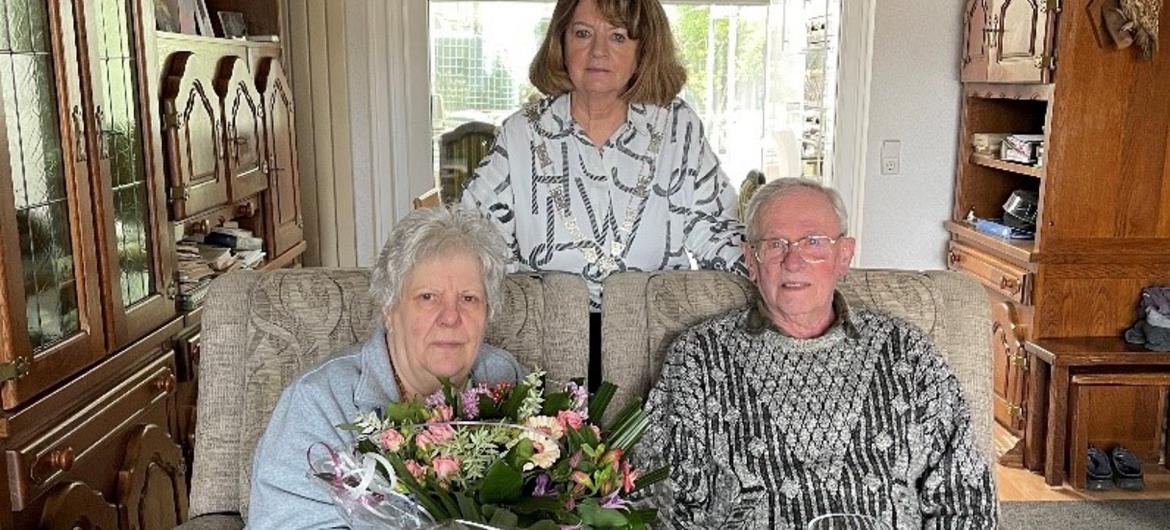 Jeu en Mia Franssen-Maassen uit Brunssum stapten 60 jaar geleden in het huwelijksbootje. Burgemeester Wilma van der Rijt bezocht het echtpaar om de felicitaties namens de gemeente over te brengen.
