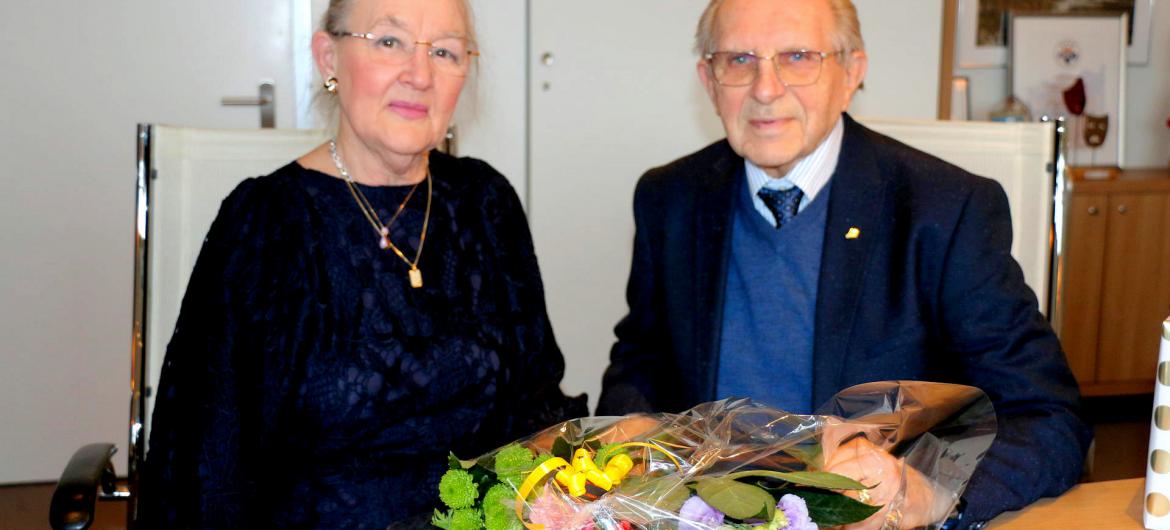 Jo en Marlies Deckers-Hellenbrand zijn zestig jaar getrouwd en werden daarom woensdag uitgenodigd op het bestuurscentrum in Brunssum. Burgemeester Wilma van der Rijt had voor het diamanten bruidspaar een mooie bos bloemen en een unieke kristallen vaas.