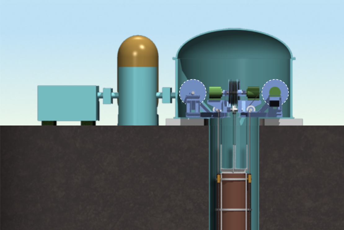Door een zware blok aan kabels van boven in de schacht te laten vallen wordt via de katrollen stroom opgewekt. Voor het weer optakelen van het blok wordt stroom van windmolens gebruikt op momenten dat die stil komen te staan omdat ze hun overcapaciteit niet kwijt kunnen.