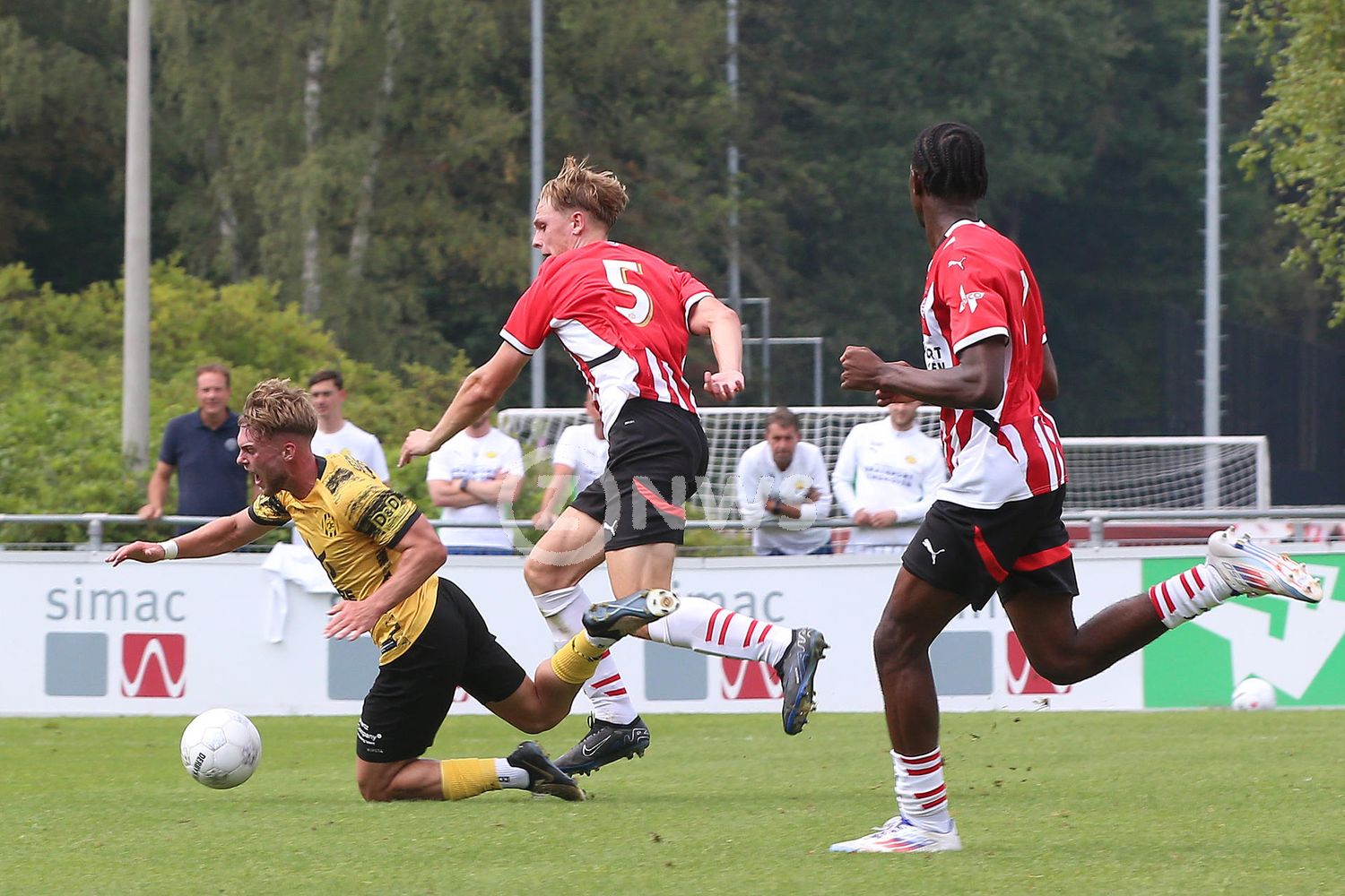 Roda-trainer Bas Sibum koos voor de beoogde basisformatie in het oefenduel dat gespeeld werd op PSV's sportcomplex De Herdgang in Eindhoven. Dat betekende dat de nieuwelingen Thomas Oude Kotte, Tim Köther, Jay Kruiver, Joshua Schwirten en Tiago Çukur allen aan de aftrap stonden. Het eerste bedrijf golfde op en neer. De van Fenerbahce overgekomen spits Çukur miste halverwege de eerste helft een strafschop.