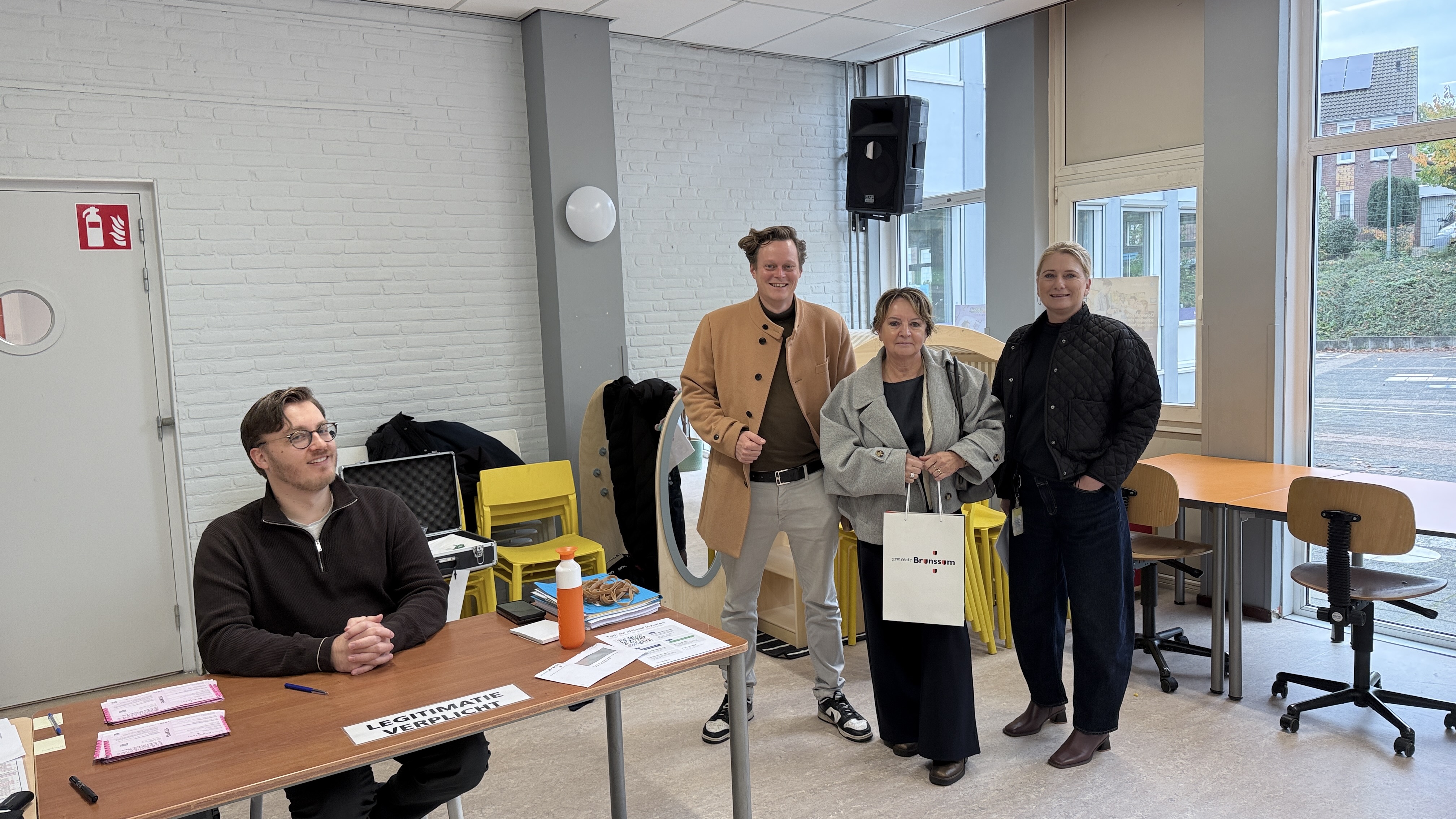 Zo brachten zij ook een bezoek aan het stembureau in basisschool De Caleidoscoop. En zij kwamen niet met lege handen. De burgemeester bracht een versnapering mee voor de leden van het stembureau.