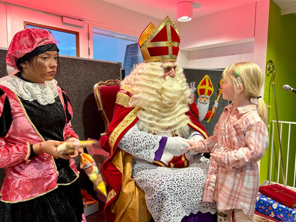 Daarna nam de Sint zitting in de school waar kinderen hem de hand konden schudden. Soms moesten de kinderen en hun papa en mama wel even geduld hebben want de wachtrij liep op tot meer dan een uur.