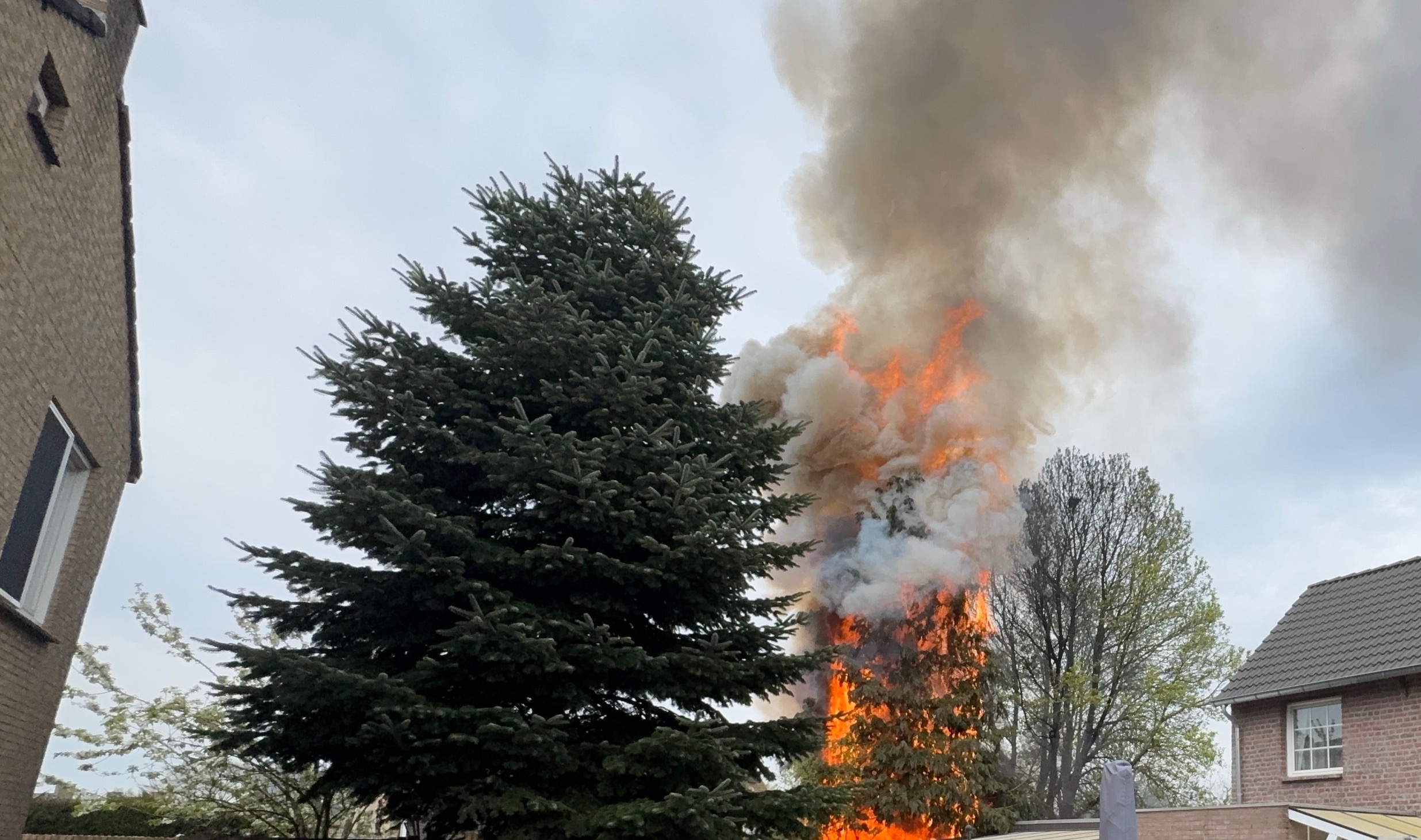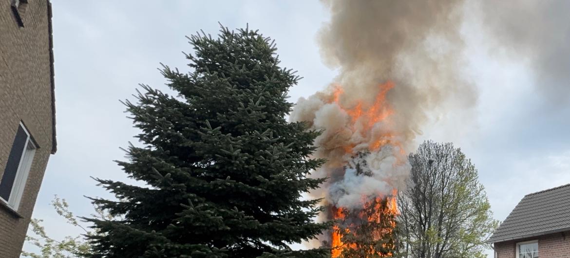 Het vuur sloeg ook over naar een grote conifeer. Een aantal dieren werd uit voorzorg geëvacueerd uit de woning van de buren.