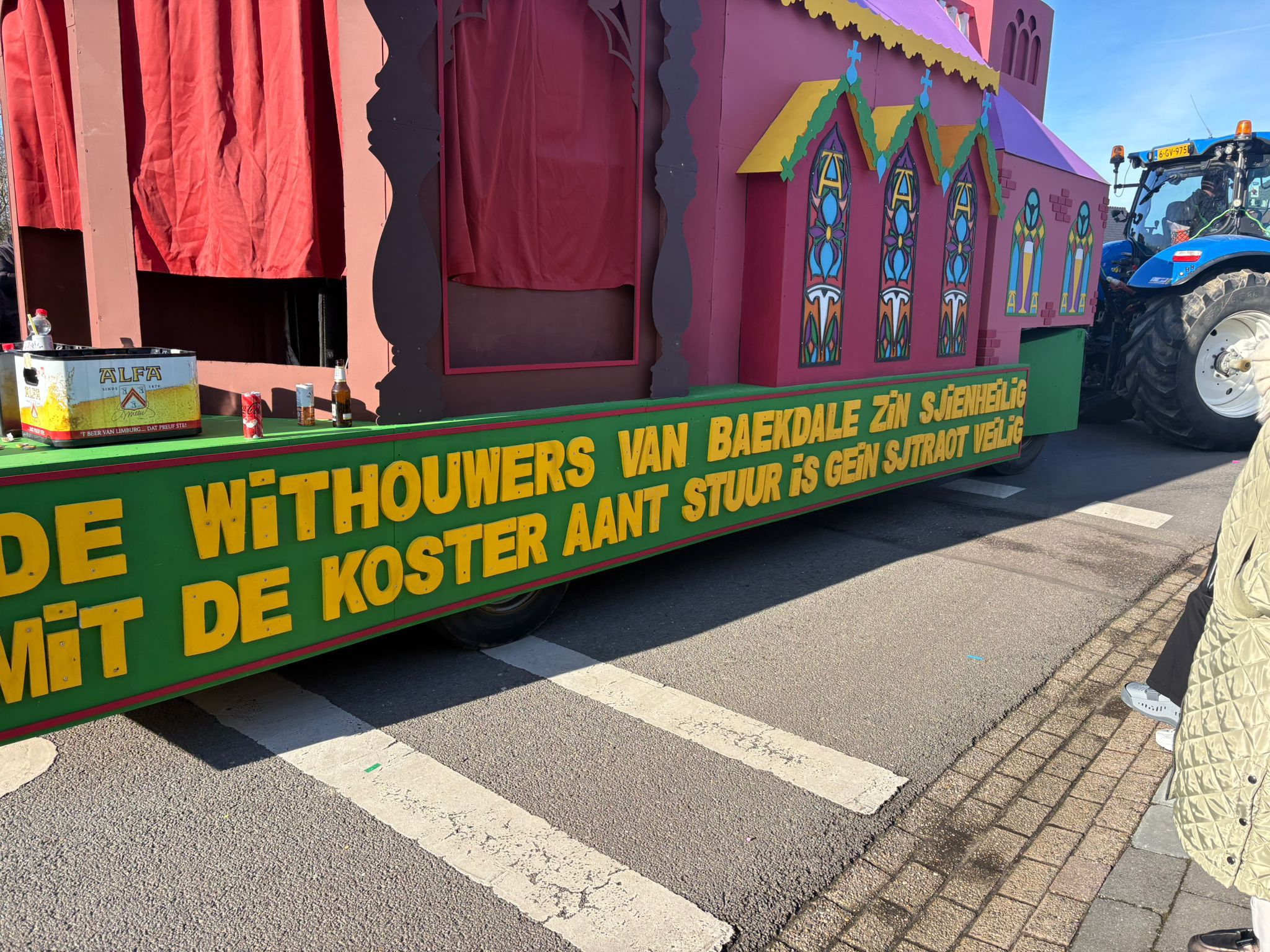Op de wagen prijkt in felgele letters de tekst: "De withouwers van Baekdale zin sjienheilig. Mit De Koster aant stuur is gein stroat veilig”. Daarmee neemt de carnavalsvereniging uit Hulsberg op ludieke wijze het incident rond voormalig wethouder Levin de Koster op de hak.