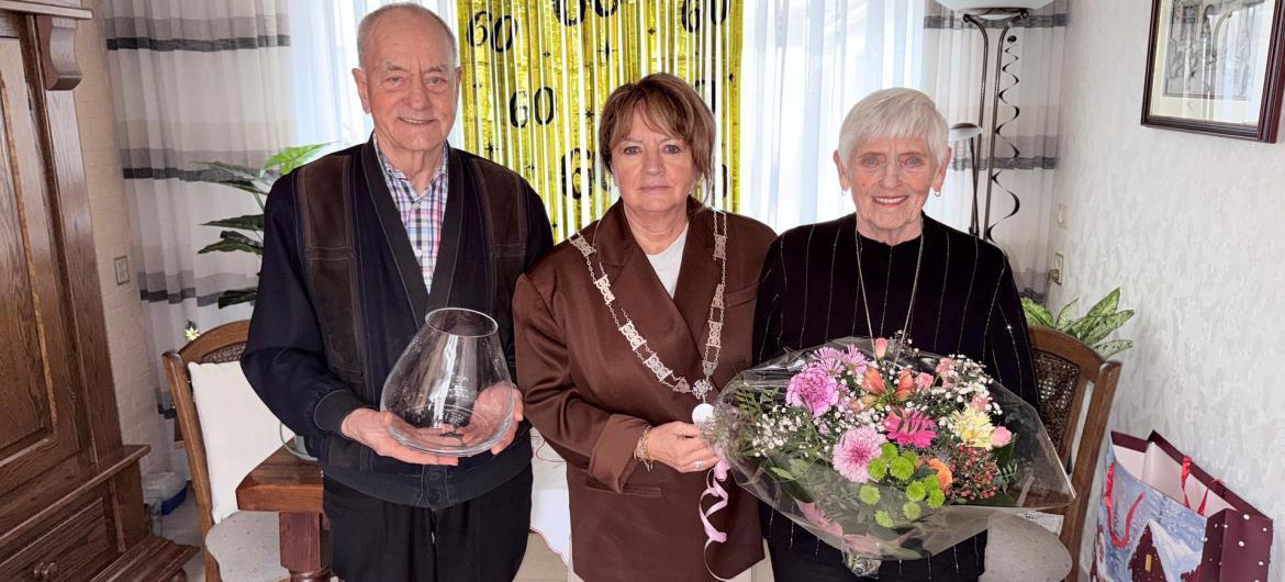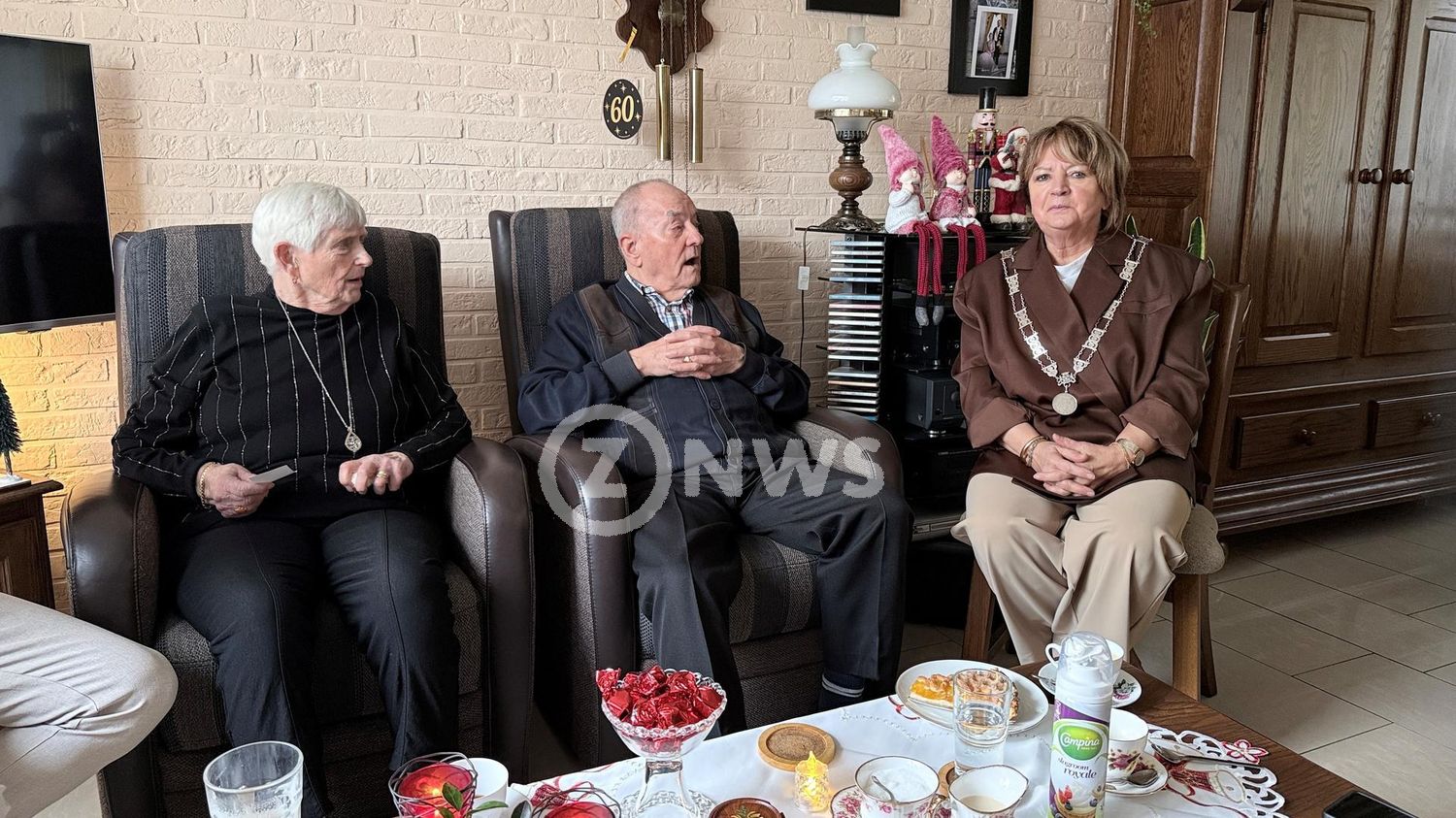 Giel en Mia Sturtz-Clement zijn het laatste diamanten bruidspaar van het jaar in Brunssum. Burgemeester Wilma van de Rijt bezocht het jubilerende paar op oudjaarsdag in hun woning aan de Koningstraat.