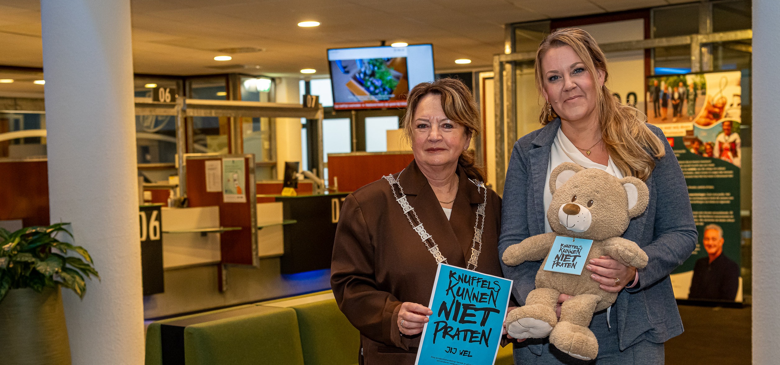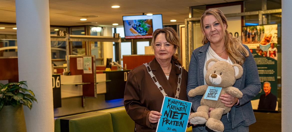 Op diverse plaatsen in Brunssum en ook in het gemeentehuis in Nuth staat deze week een knuffelbeer. De knuffel is dit jaar het symbool van de Week tegen Kindermishandeling.
