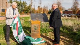 Plaquette onthuld bij monumentale muur Staatsmijn Wilhelmina Wethouder Alexander Geers noemt het een mooi initiatief van de koempels om deze muur zichtbaar te maken.