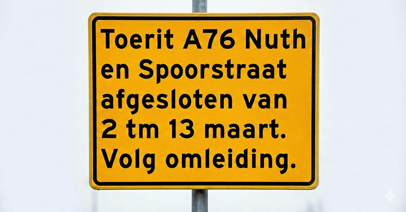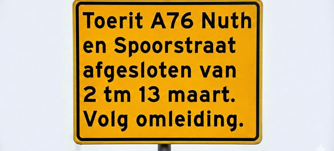 In Nuth is de toerit naar de A76 richting Heerlen afgesloten vanaf maandag 2 maart. Dat komt door rioleringswerkzaamheden in de Spoorstraat.