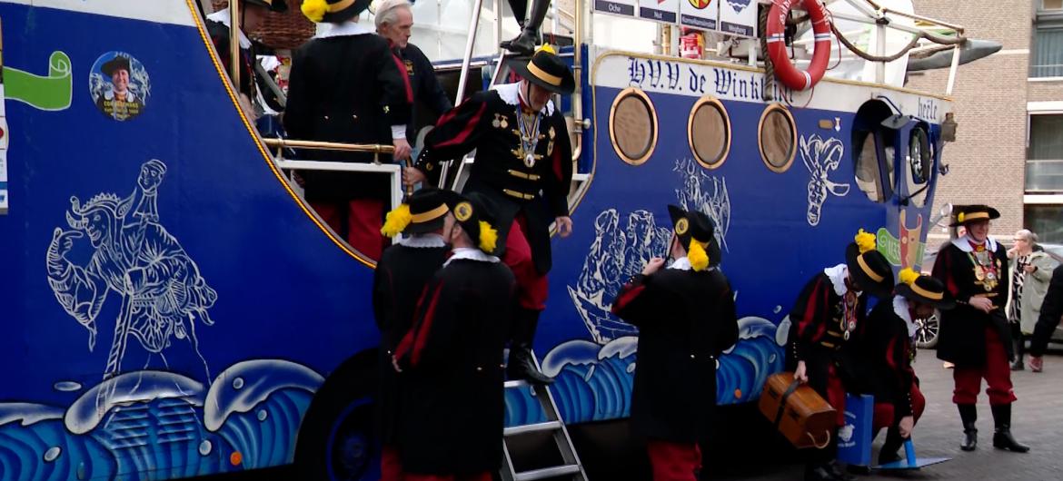 De Blauw Sjuut begon maandag aan hun rondgang door de Euregio. Eén van de eerste plaatsen die het gezelschap uit Heerlen met het opvallende narrenschip op wielen bezocht, was het gemeentehuis in Simpelveld.