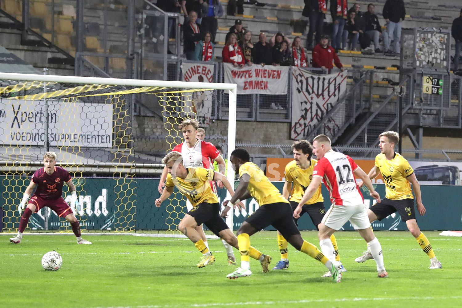 In de 62e minuut kwam FC Emmen terug in de wedstrijd en scoorde ex Roda JC-er Romano Postema, die vrij mocht doorlopen op keeper Justin Treichel, de 2-1. Het laatste kwart van de wedstrijd moest FC Emmen met tien man verder nadat Lukas Larsen zijn tweede geel en daarmee de rode kaart zag. Het publiek ging er nog eens achter staan, maar het was FC Emmen dat scoorde en alweer Postema.