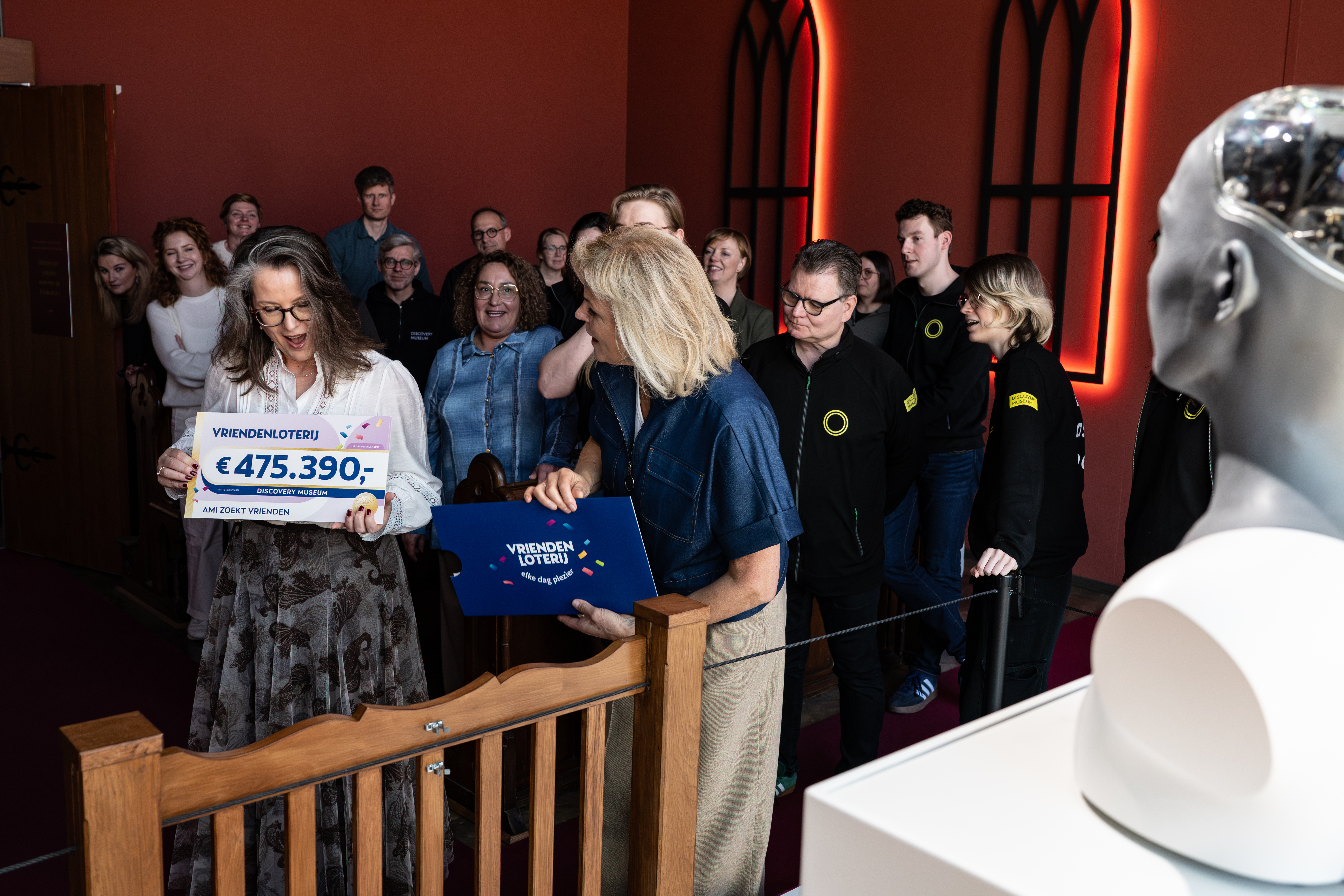 Irene Moors verraste woensdag directie en medewerkers van het Discovery Museum in Kerkrade met een cheque van 500.000 euro namens de VriendenLoterij. Met haar bezoek kreeg het project Ami zoekt vrienden! een zichtbaar en menselijk startmoment.